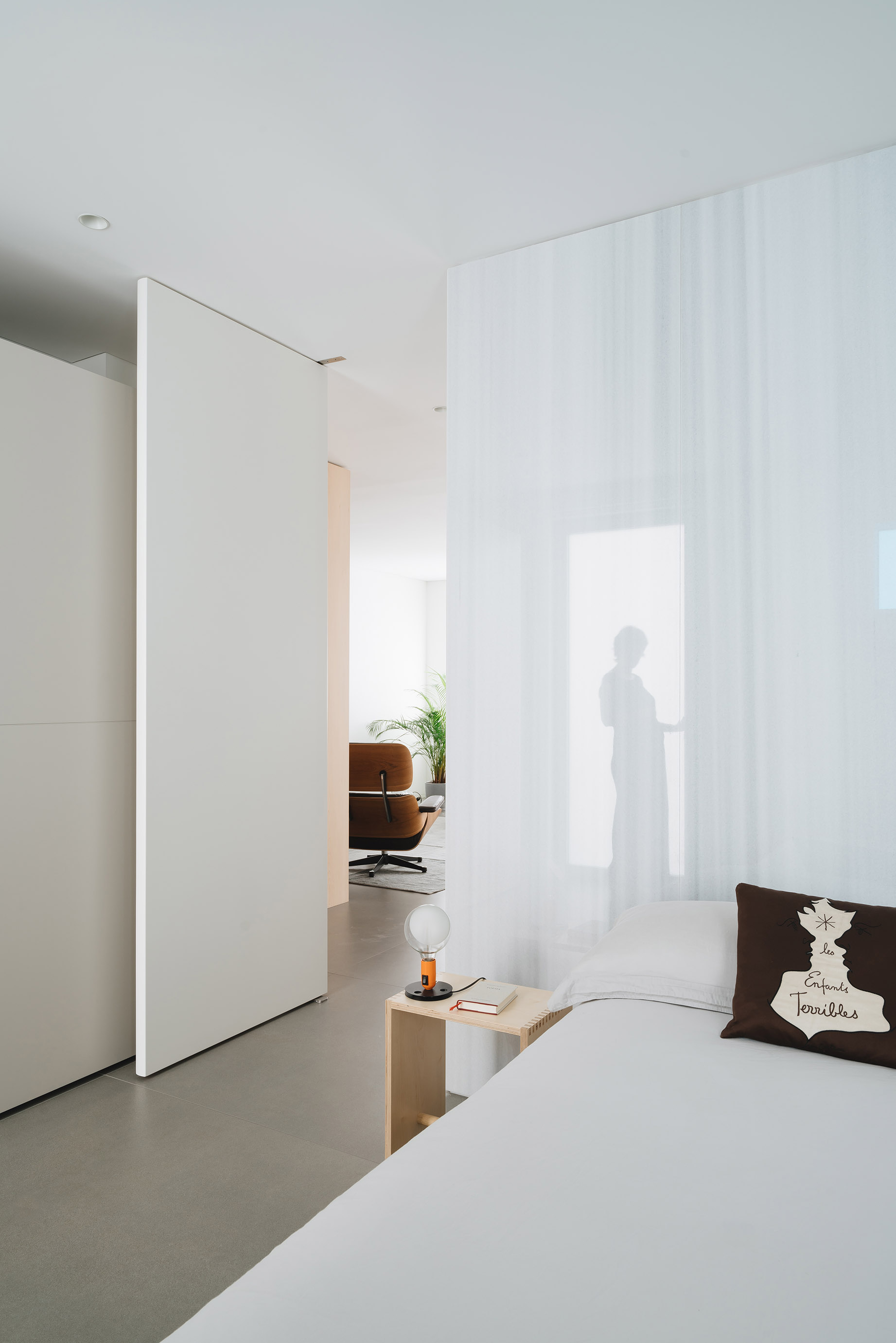 Así, ambas estancias quedan conectadas en los laterales de la pieza de mármol, a través de grandes puertas pivotantes que, normalmente, permanece abiertas. La luz natural alcanza a toda la vivienda, puesto que ambas fachadas cuentan con ventanas de gran tamaño: en el salón, las grandes ventanas miran a una calle principal, y se orientan hacia el sureste; mientras que, en la habitación, dos altos ventanales permiten el acceso a una terraza que vuelca sobre un amplio patio de manzana.