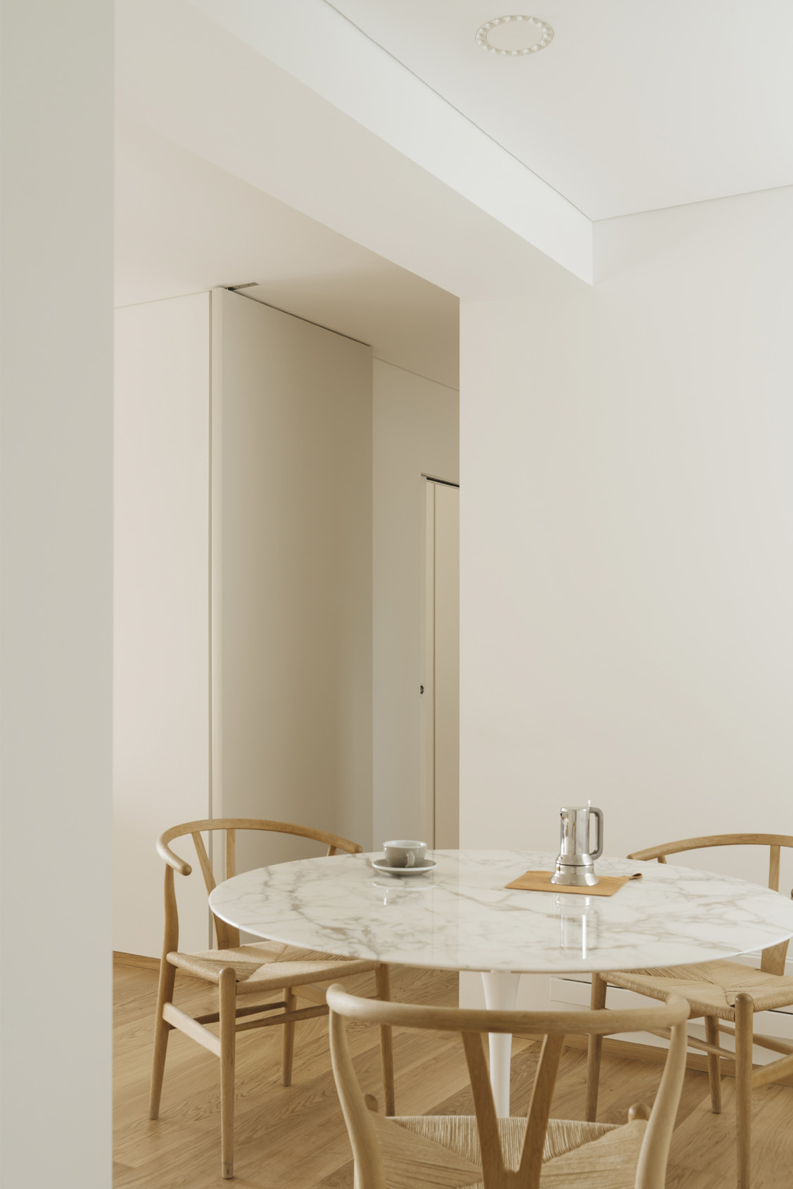 Blancos y abstractos, los muebles Bulthaup dialogan con el mármol de la mesa Tulip y la madera de roble en suelos y en las sillas CH24. El revestimiento cerámico del frente de cocina, con una textura sedosa y beige, suaviza la entrada de luz. Los tiradores y cantos en aluminio añoaden un punto de distinción al conjunto.