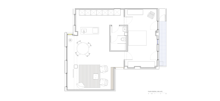 Así, ambas estancias quedan conectadas en los laterales de la pieza de mármol, a través de grandes puertas pivotantes que, normalmente, permanece abiertas. La luz natural alcanza a toda la vivienda, puesto que ambas fachadas cuentan con ventanas de gran tamaño: en el salón, las grandes ventanas miran a una calle principal, y se orientan hacia el sureste; mientras que, en la habitación, dos altos ventanales permiten el acceso a una terraza que vuelca sobre un amplio patio de manzana.