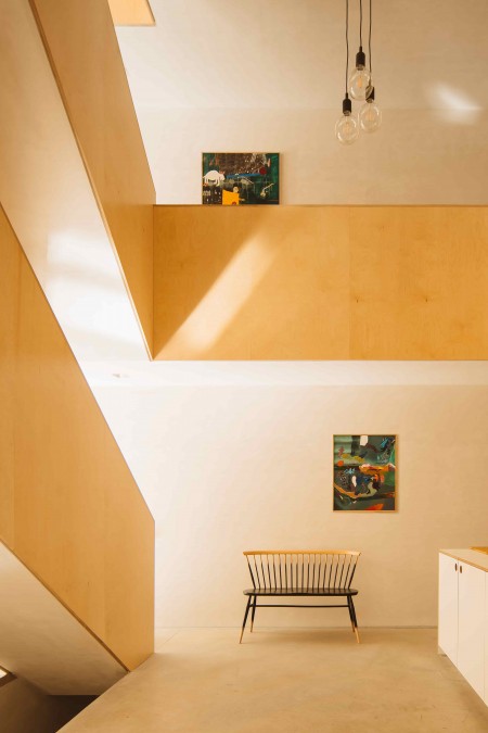 La vivienda dispone de tres dormitorios, cocina, salón y un espacio de taller para el artista. Conformada por cuatro niveles, la residencia articula de manera meticulosa los espacios para conjugar la vida diaria, la actividad creativa y la exposición de una extensa colección de obras de arte. La escalera central, más que un simple conector vertical, actúa como un dispositivo de filtrado, ofreciendo privacidad según la necesidad de los espacios que la rodean. Una serie de pasarelas, intercaladas entre espacios de doble altura, describen el recorrido expositivo del proyecto.