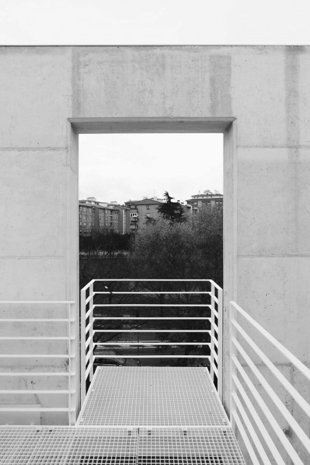 Se asoma generando un balcón que, si un uso específico (es una escalera de evacuación), constituye un mecanismo de negación de la propia idea: toda la operación de ocultamiento se derrumba cuando la escalera asoma en la parte alta del hueco.