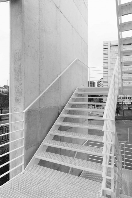 La segunda escalera, emplazada en el patio trasero, guarda estrecha relación con su homóloga. Su construcción metálica es idéntica, y también lo son su forma y sus detalles. Ahora bien, esta escalera ya no necesita la careta, ya no requiere mimetizarse con la antigua fachada puesto que se encuentra en el interior del propio recinto escolar, en una zona poco visible. La careta, ahora, se ha convertido en un gran rectángulo de acero, que mantiene su función estructural y pierde la intención visual presente en la primera escalera.