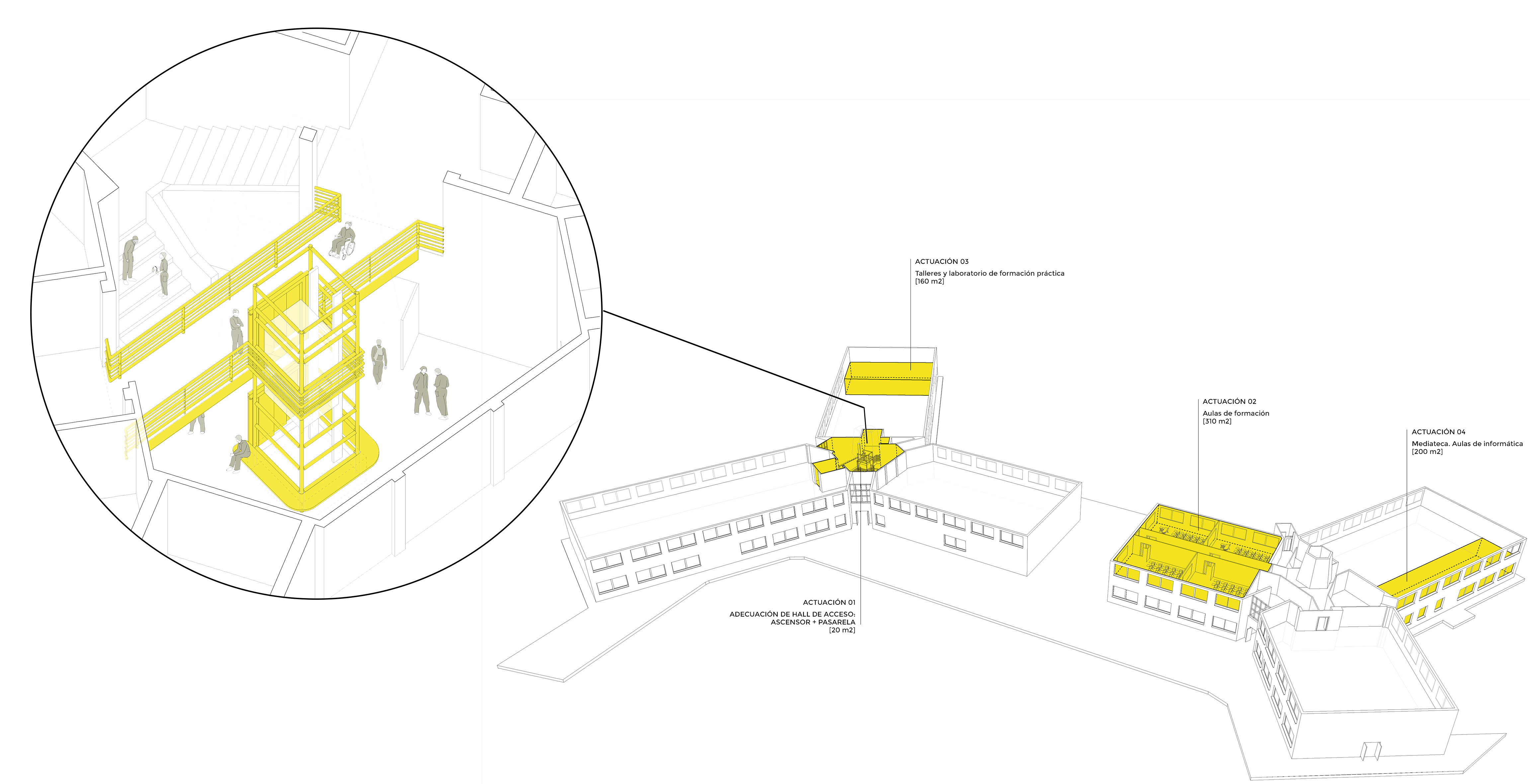 El ascensor, entendido como eje de la intervención, forma parte de un proyecto más amplio: la reestructuración global y de mejora de la accesibilidad de un centro de Formación Profesional de Madera y Electrónica, perteneciente al Departamento de Educación del Gobierno de Navarra.