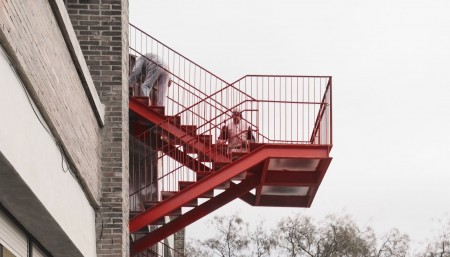 A nivel constructivo la estructura del elemento es íntegramente metálica y autoportante. El núcleo resistente es el ascensor que se ancla al suelo mediante una cimentación de hormigón armado. Los tramos de escalera se suspenden de dicha pieza y vuelan de forma ligera sobre el patio, evitando interferir en él, creando unas terrazas que miran a la huerta Navarra.
