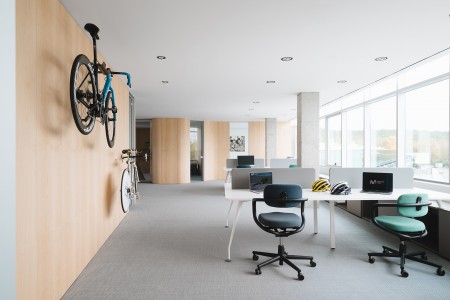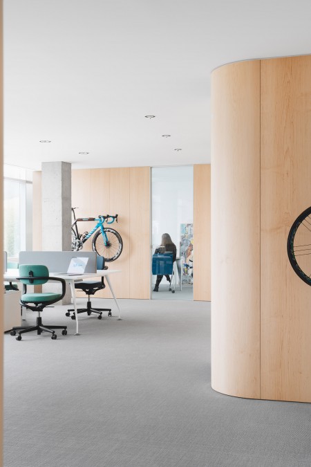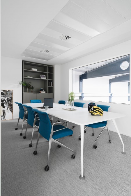 Finalmente, el mobiliario, cuidadosamente elegido, complementa las cualidades del espacio. Sin caer en estridencias ni exageraciones, se recurre a una sillería cuyas formas y colores concuerdan perfectamente con el ambiente de la oficina. En concreto, toda la zona central se equipa con las sillas Allstar de VITRA, en distintos colores verdes y azulados. Las formas curvas de estas sillas se asocian perfectamente con las formas de las bicicletas; los reposabrazos, de hecho, casi parecen manillares negros amontonados en el pelotón. En los despachos y en las salas de reunión se recurre, en cambio, a piezas algo menos dinámicas, pero quizá más elegantes, como son las ID chair de y las AC5, también de VITRA, terminadas en grises y azules. Las mesas muy ligeras y discretas son el modelo CELL de Dynamobel; y los armarios, de CIQUANTA3, también discretos, aportan la nota final con sus colores cremas y agrisados.