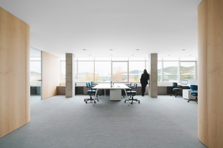 Todo ello condensó en una propuesta espacial que se conforma con líneas oblicuas y orgánicas, sinuosas si cabe. En concreto, unos paramentos de madera de Maple -cuyas esquinas se ejecutan con piezas cuidadosamente curvadas- configuran el espacio central de trabajo. Tras estos paramentos, y conectados mediante puertas de vidrio con marcos casi invisibles, quedan las oficinas de los altos cargos y una gran sala de reuniones. También, en este caso tras una puerta más discreta acabada en maple, se encuentran los aseos y el office.